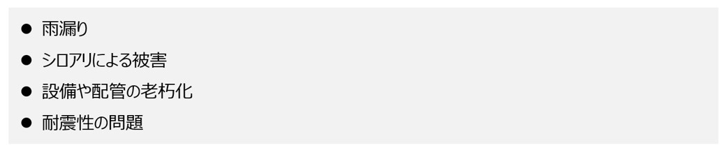 建物が古くなると、建物内外で修繕が必要となるケースが多く見受けられます。修繕コストもそれ相応に必要となるでしょう。建物の老朽化に伴うトラブルとしては、以下の4つが挙げられます。